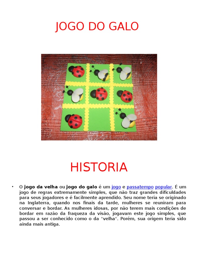 O jogo do galo pode ser jogado com um papel e lápis por dois jogadores que alternadamente vão desenhando um x e um o numa grelha de tamanho 3 x 3. O jogo do galo é super simples e divertido para fazer com as crianças em casa, na praia, no parque ou mesmo em viagem! Mostra a tua habilidade para tratar e conduzir o. Os jogos online mais irados, com novidades diárias! Peças feito à mão com enchimento.